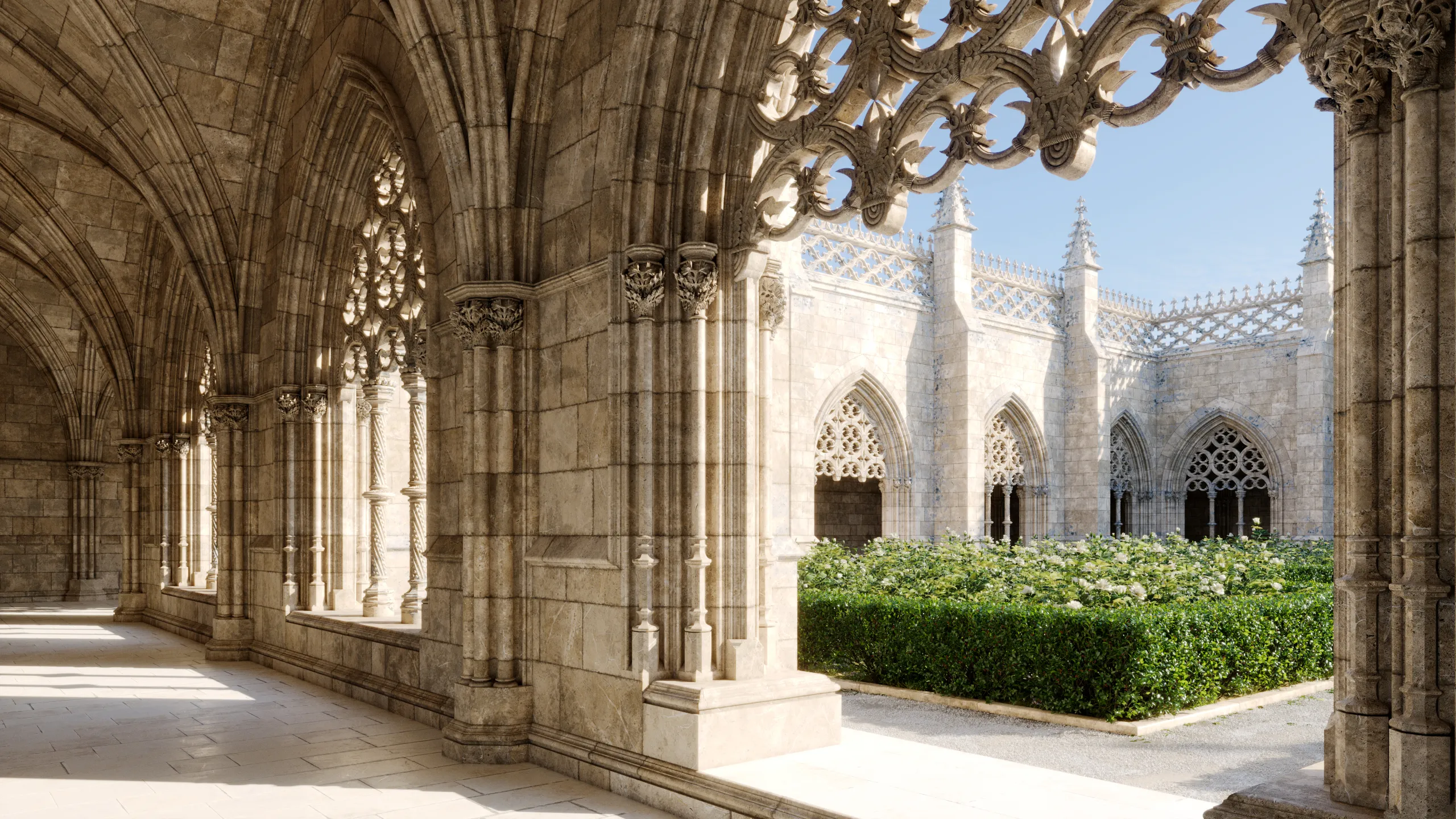 A continuation of the Gothic interiors analysis, extending their monumentality into the outdoor realm. Inspired by the classical structure of Persian gardens (Chahar Bagh), the design divides the space into four quarters through axial paths symbolizing rivers flowing to the four corners of the world. It is a synthesis of raw Manueline detail and the mathematical order of the Orient—a place where the sacredness of architecture meets the geometric tranquility of nature.