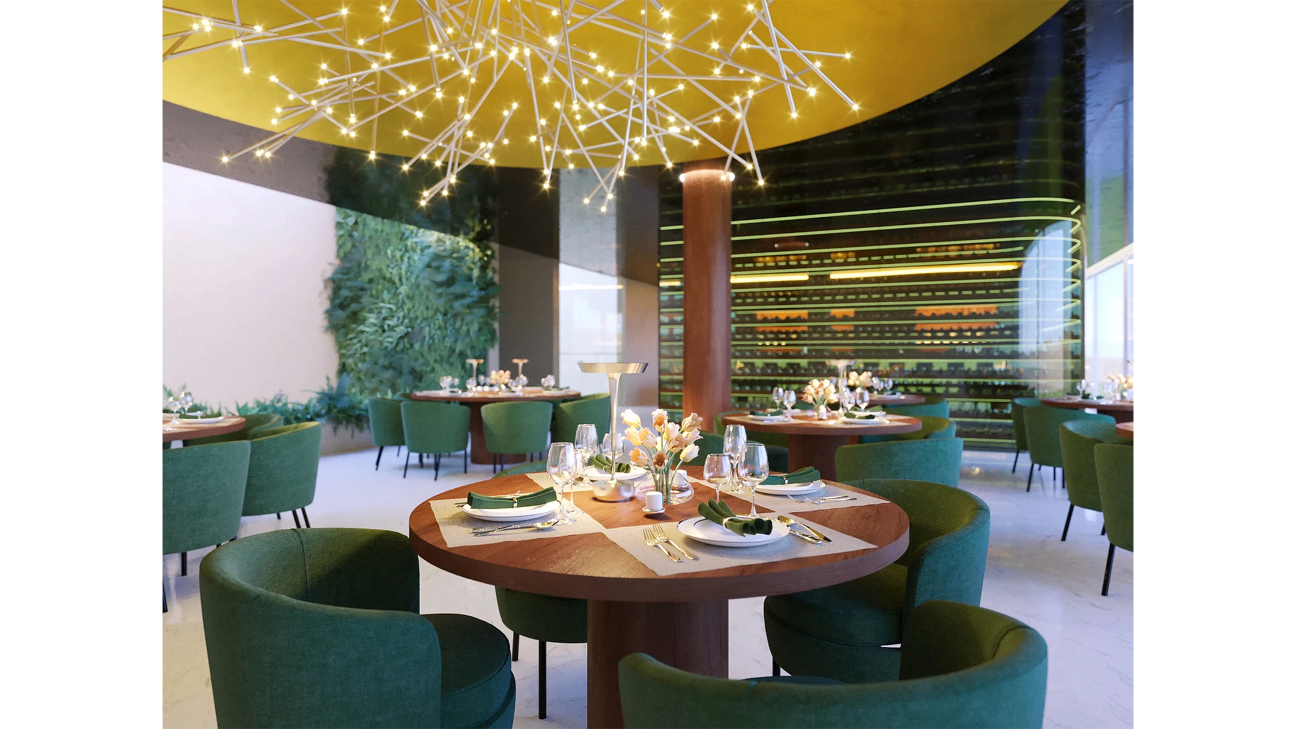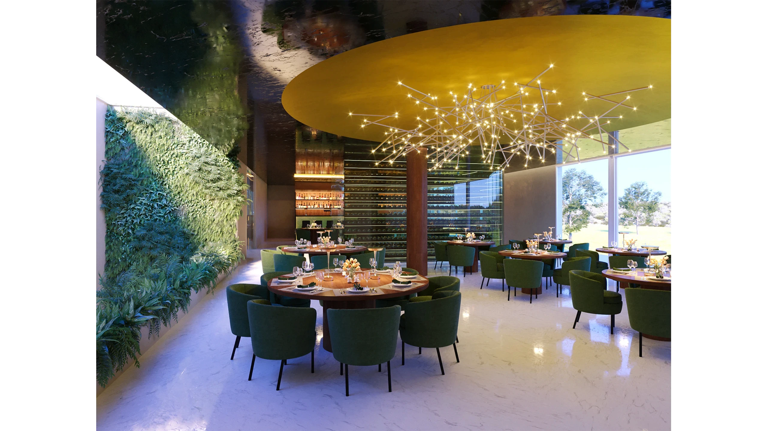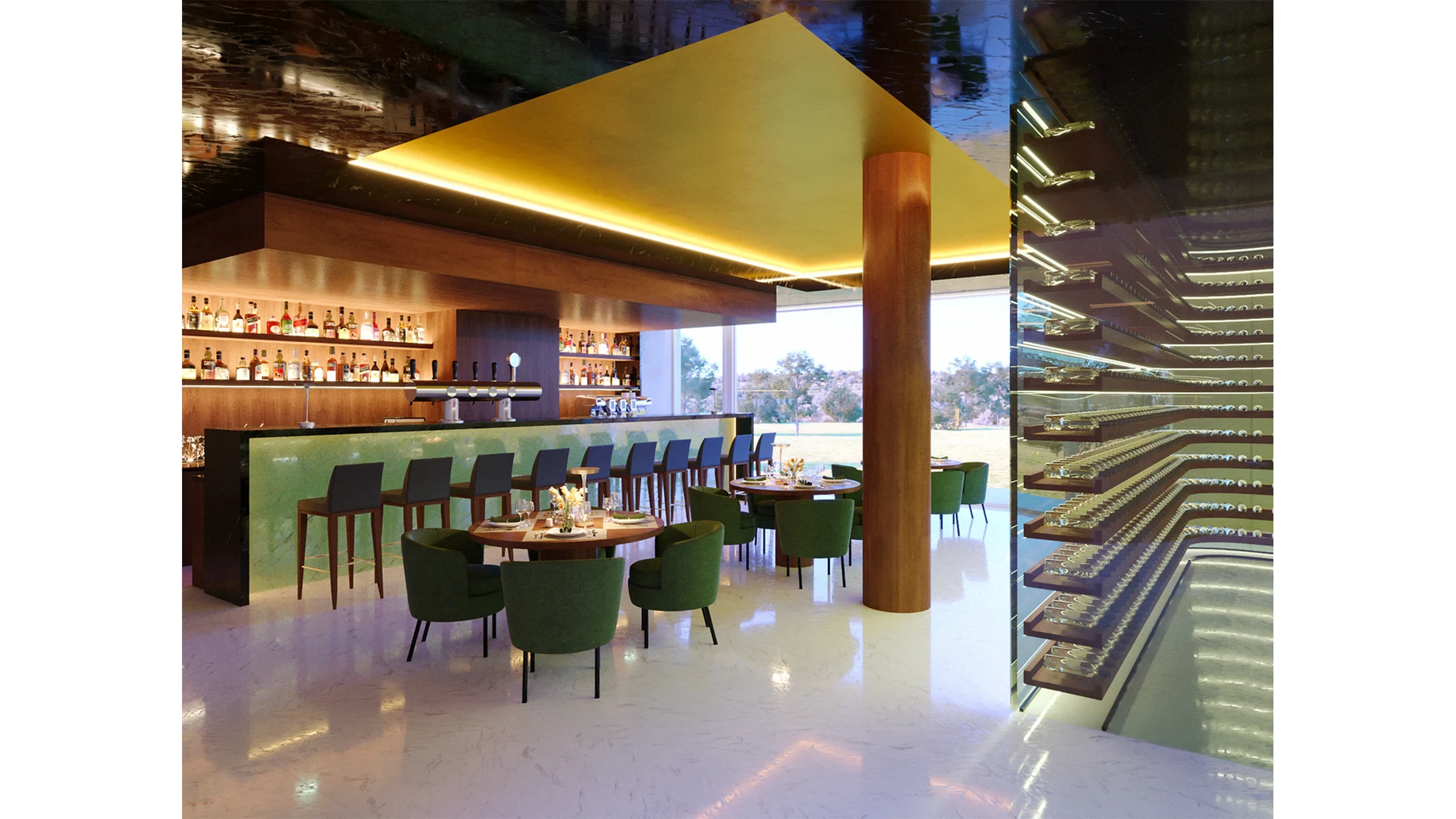 An interior design project focused on a luxurious material palette and the play of light. The primary concept was to create an elegant, darker space where a glossy black ceiling reflects golden details and warm lighting. The use of marble floors combined with wooden elements and deep green upholstery creates an atmosphere of prestige and intimacy. Designed based on client guidelines, blending functionality with sophisticated aesthetics.