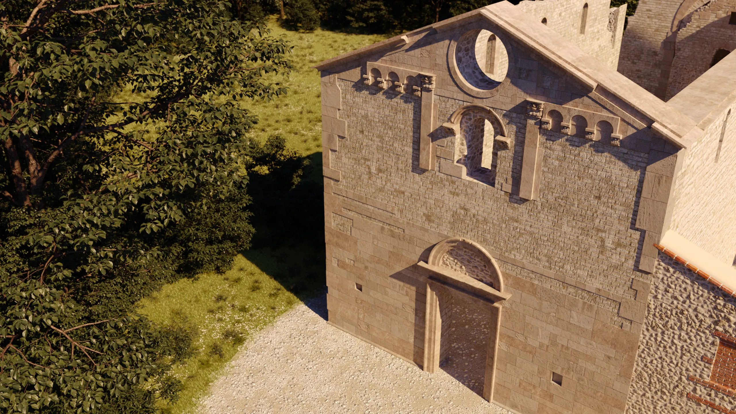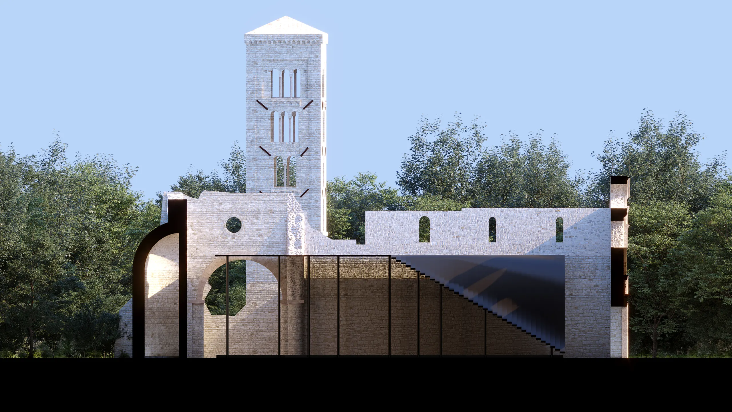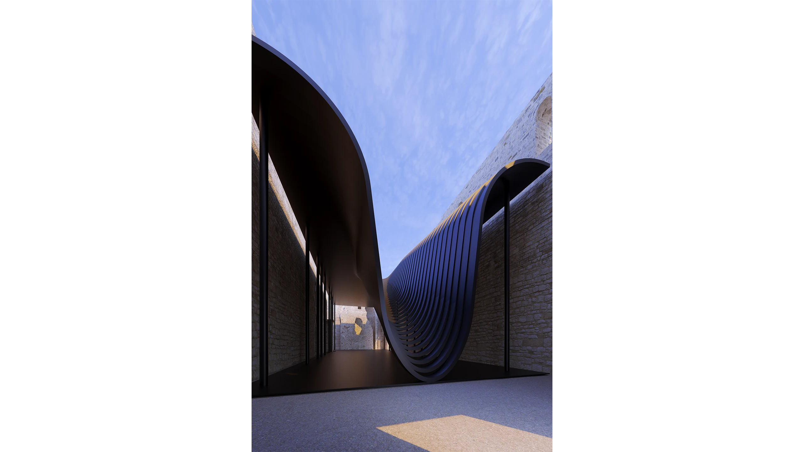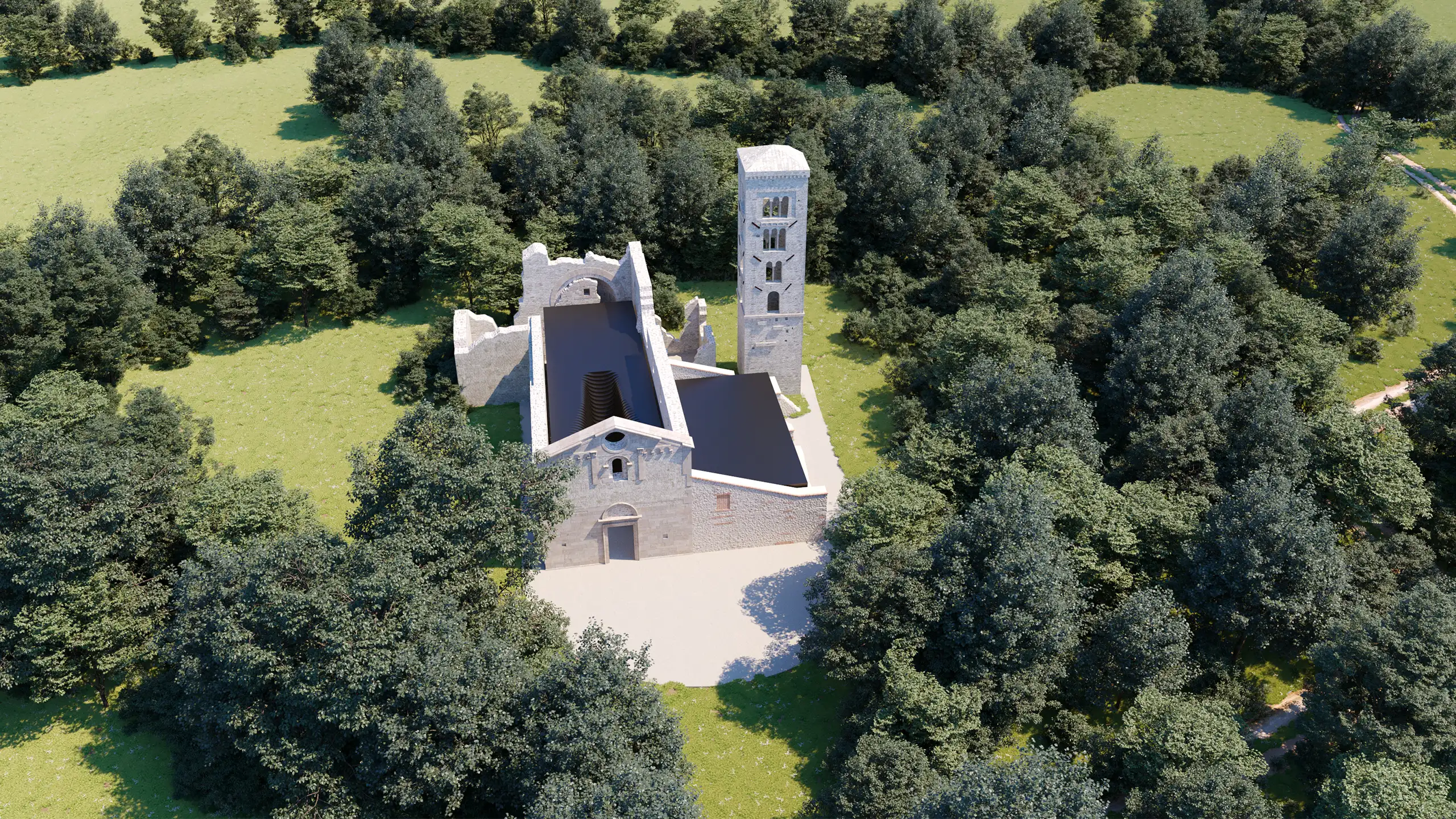 A competition entry for the international "Reuse the Church" contest organized by Reuse Italy. The project aims to transform the ruins of an abandoned church within the Gessi Bolognesi Park into a modern multi-faith center. vision introduces a fluid, sculptural roof form that creates a space for reflection and spiritual dialogue, while maintaining full respect for the historic wall structures and the surrounding landscape.