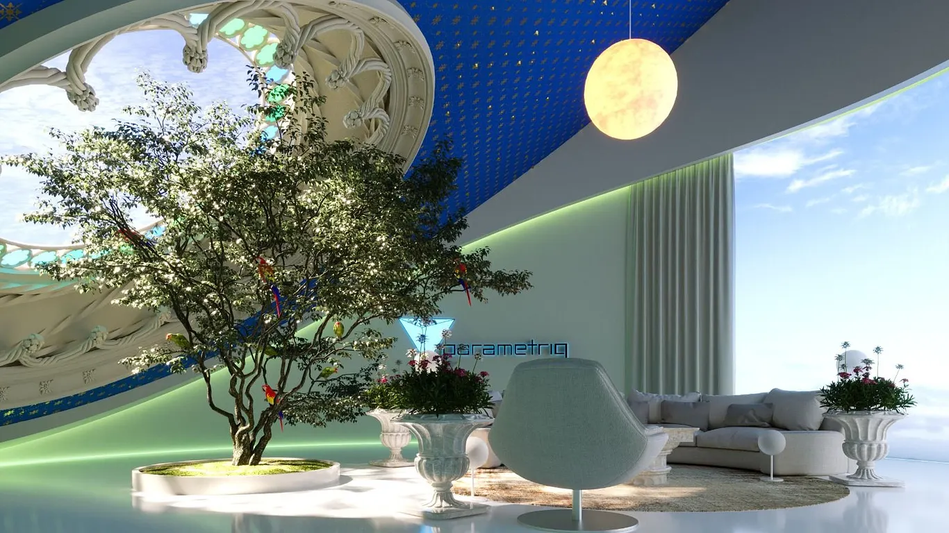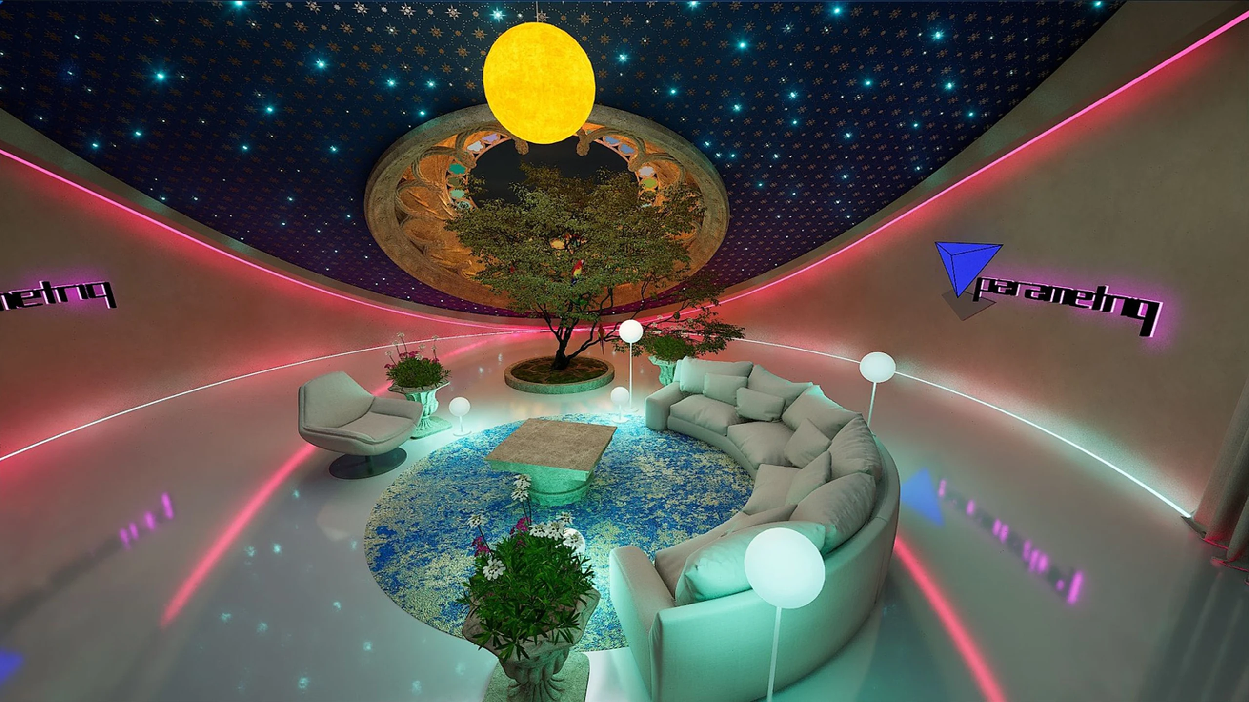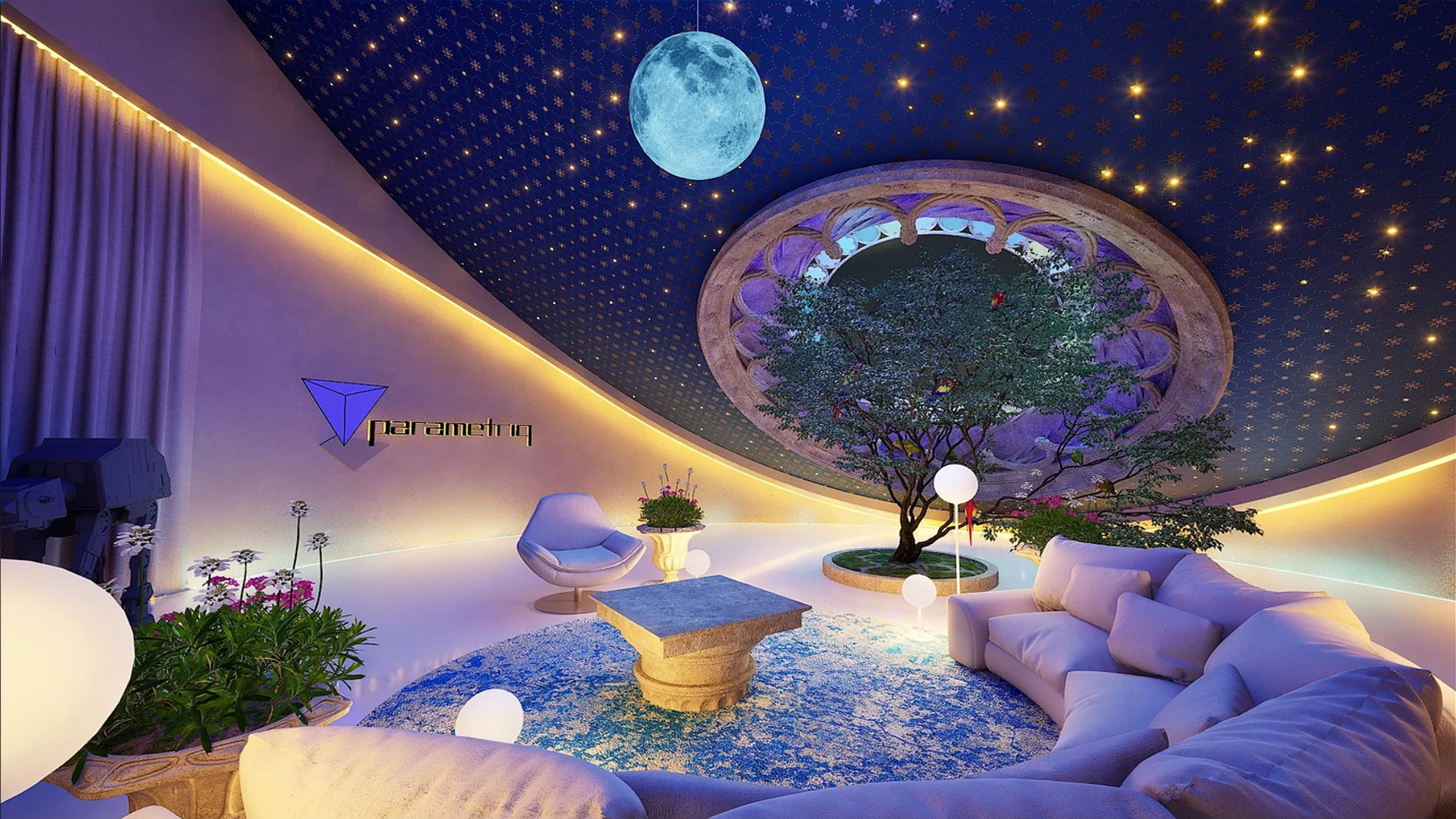 A unique, original real-time virtual studio project created in Unreal Engine for a South Korean client. The concept is based on a fascinating dialogue between history and modernity. A tilted ruin of a Portuguese Manueline-style church becomes the ceiling, supported by a futuristic cinema screen. This interior is a personal journey: the vault is adorned with stars inspired by the ceiling of St. Mary's Basilica in Kraków, blending my Polish roots with my current home in Portugal. The space offers endless lighting possibilities—from stained-glass window-lamps to a starry sky and a central lamp that serves as the sun by day and transforms into a glowing moon by night. The interior is cozy and "homey," breaking away from cold, futuristic stereotypes.